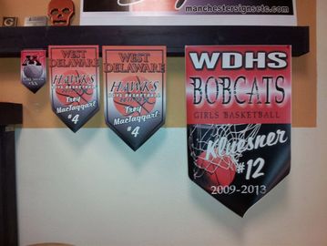 Our banners come in four heights ( 30" 36" 48" 54" ), and lengths up to 40' but from this variety of sizes we can custom build a banner to your specifications needed. We make pennant banners of any size, perfect for your boy or girls lockers to show their school pride. We use Vinyl, Mesh, or Fabric materials with full-color CMYK digital printing, with materials made in the USA.