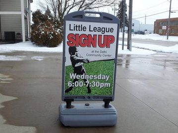 Wind Sign II has heavy duty springs that connect the frame to the base allowing the sign to resist strong winds (up to 60mph - base filled with 115 lbs. of dry sand), and return the sign to its upright position. Convenient " Quick Change " feature enables the sign blanks to be changed in seconds with no hardware, and allows two-sided panels for additional advertising. Factory installed wheels in the base allow easy mobility. 36" H by 24" W or larger is available.